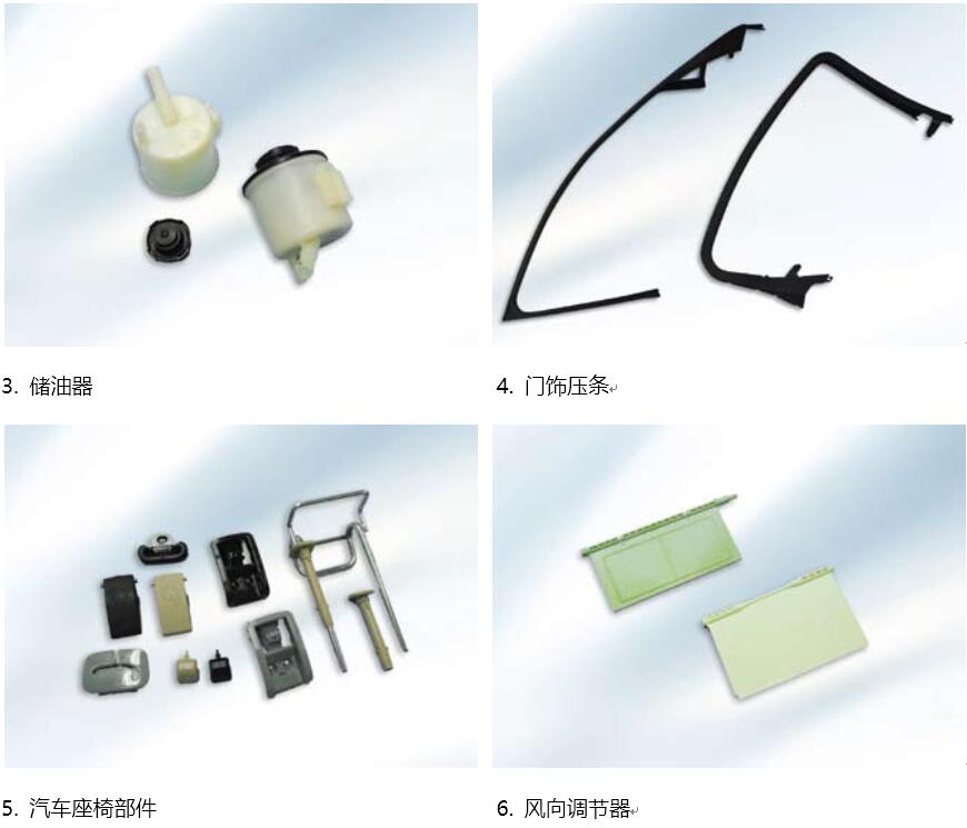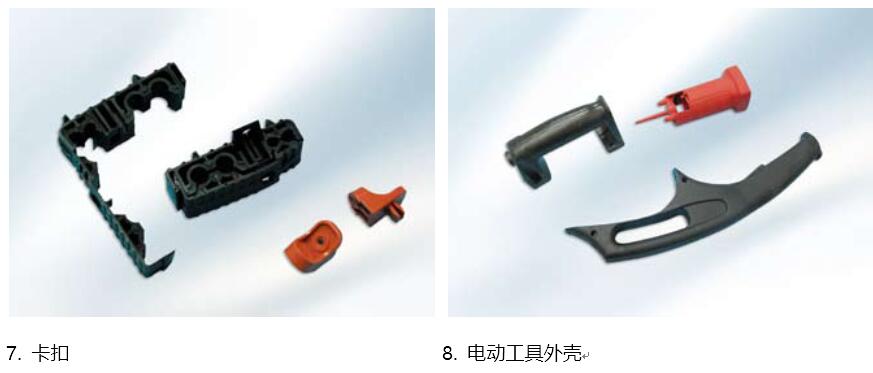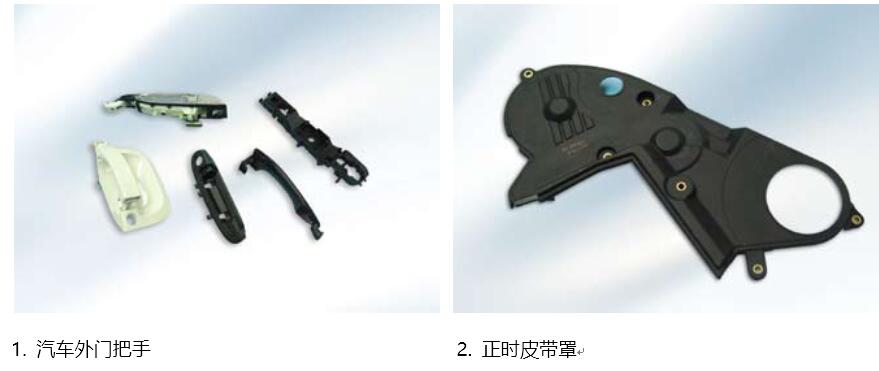 有高機械強度或耐熱要求的部件:噴油嘴,門飾壓條,汽車外門把手基座,正時皮帶罩,油箱,氣囊外殼,電動工具外殼