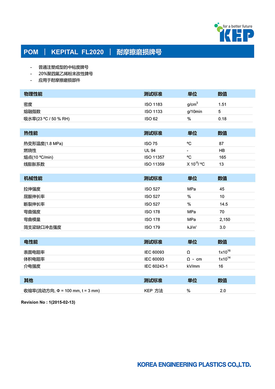 FL2020 共聚甲醛(POM)  |  韓國工程塑料(株)  |  耐摩擦磨損牌號、比磨損量低