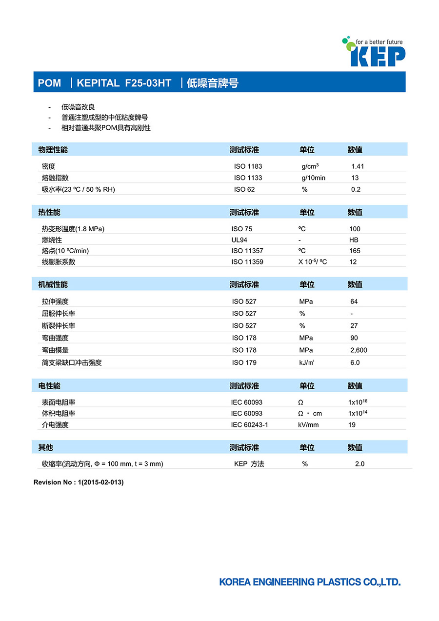 - 低噪音改良- 普通注塑成型的中低粘度牌號- 相對普通共聚POM具有高剛性