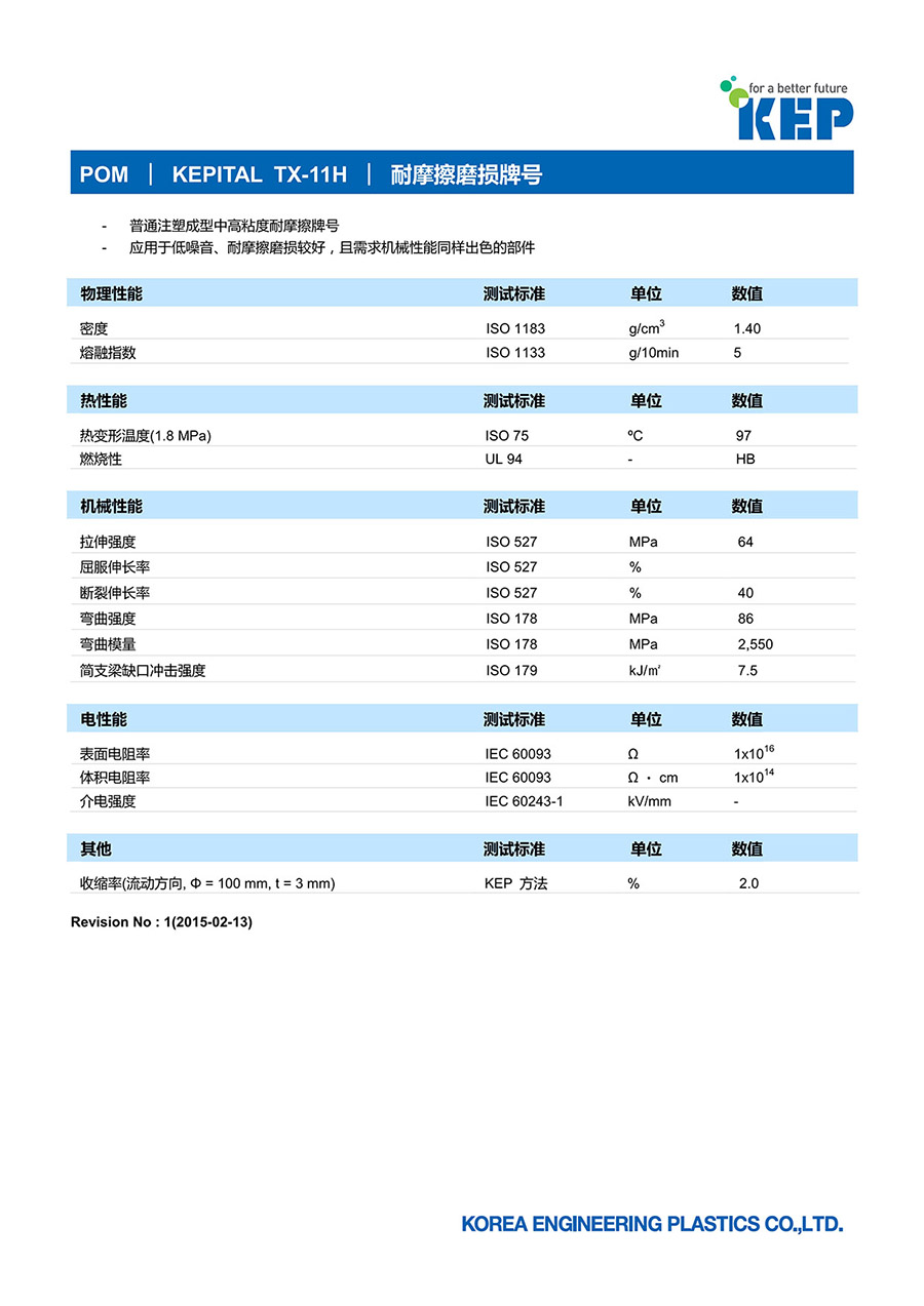 TX-11H 共聚甲醛(POM)  |  韓國工程塑料(株)  |  與金屬摩擦時耐摩擦性好、高粘度
